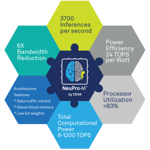 We have run benchmarks over several designs, comparing models built on combinations of NeuPro-M features. We see 1.5 order of magnitude in performance improvement in frames per second, outstanding power efficiency of 24 Tops/Watt, and up to 6x in bandwidth reduction, compared to CEVA’s previous gen NeuPro architecture.