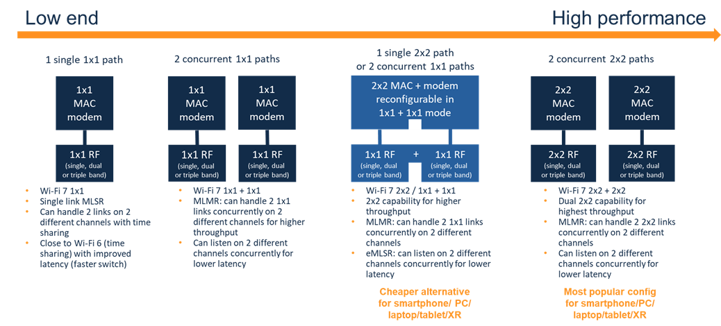 Finally as mentioned earlier the full 2×2 MLMR serves the premium end of this range. The range of configurations may seem a bit confusing at first but makes perfect sense for OEMs who need to serve different markets at the right cost/power/performance point while also future proofing for Wi-Fi advances and being able to take advantage of the marketing buzz around Wi-Fi 7.